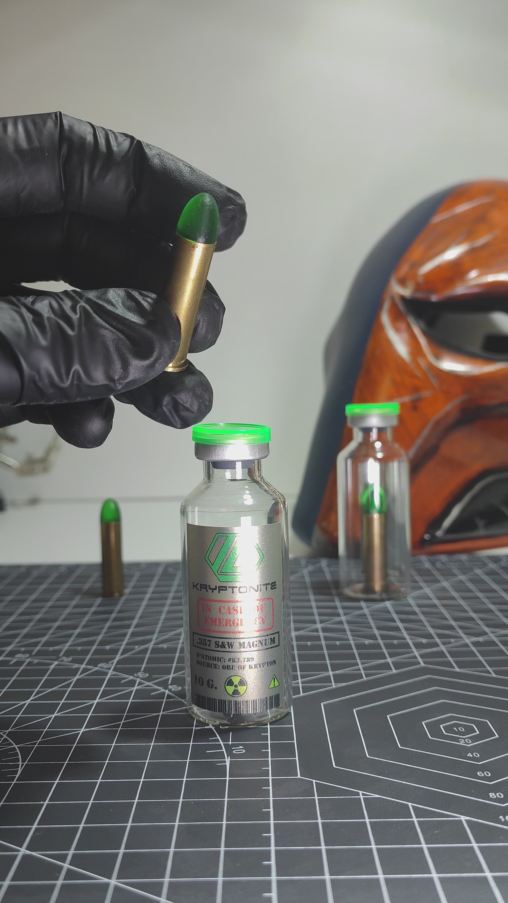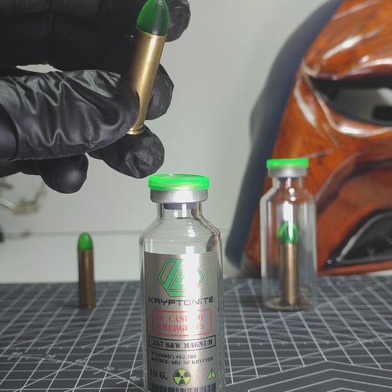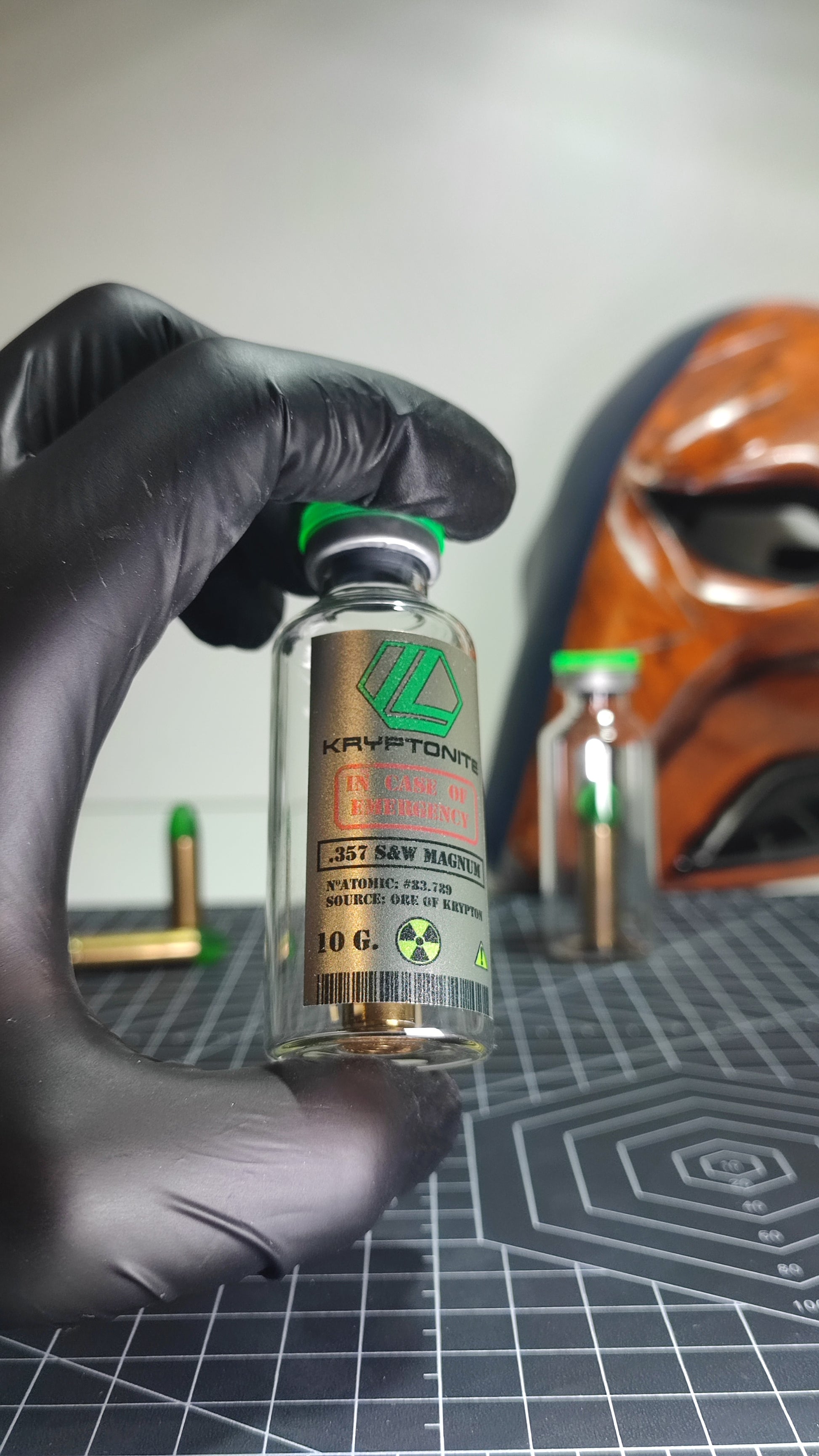 Superman tenia este tipo de munición! que aunque el metal es de un cartucho real de .357 MAGNUM ,esta completamente inservible y no hay problemas para nadie. Eso lo convierte es algo único en el mercado, traído directamente de los laboratorios de Lex Luthor.