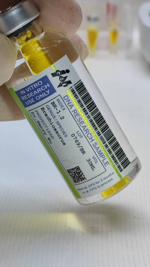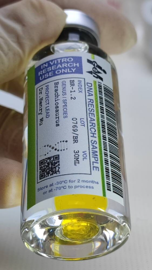 Se trata de un vial de 30 ml inspirado en la saga de Jurassic park. Contiene una ampolla relleno de un liquido espeso amarillo (Muestra ADN) donde flota en el una replica de embrión de dinosaurio 8 de semanas de vida.