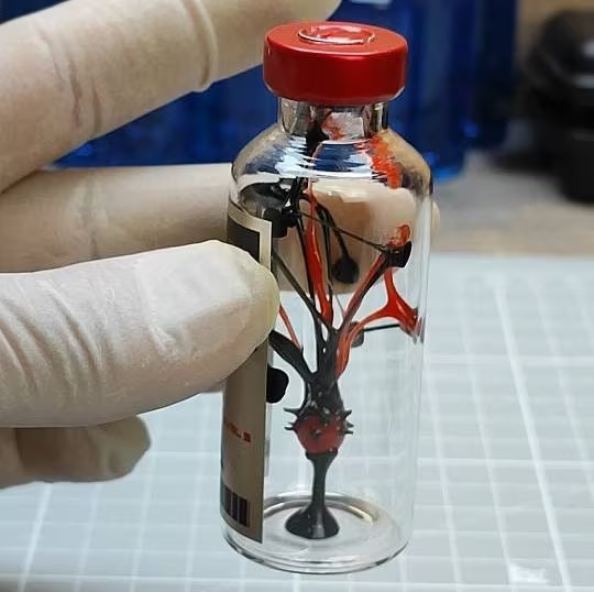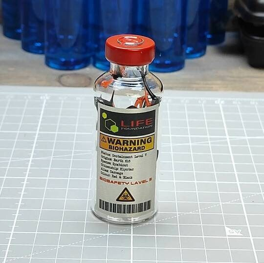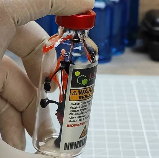 Vial inspirado en los Cómic de Marvel. En el se encierra el Simbionte Carnage, uno de los grandes enemigos de Spiderman .Esta realizado en un vial de 30ml de vidrio de grado médico y sellado como tal. Tiene una altura de 7cm y el Simbionte del interior está realizado a mano desde el interior!. Cada Simbionte es diferente , no hay dos iguales! Un objeto alucinante para los fans de Marvel.