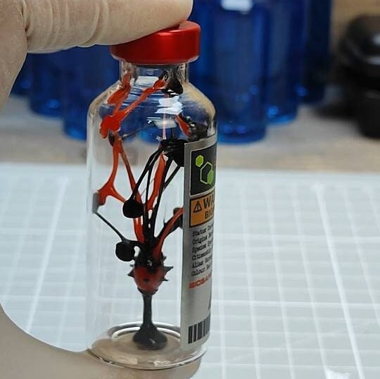 Vial inspired by the Marvel Comics. It contains the Venom Symbiote, one of Spiderman's great enemies. It is made in a 30ml vial of medical grade glass and sealed as such. It has a height of 7cm and the Symbiote inside is made by hand from the inside! Each Symbiote is different, no two are alike! A mind-blowing item for Marvel fans.