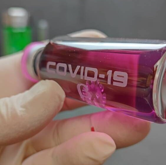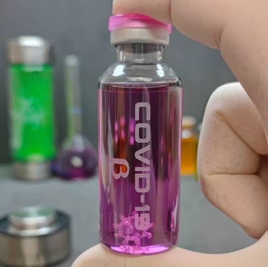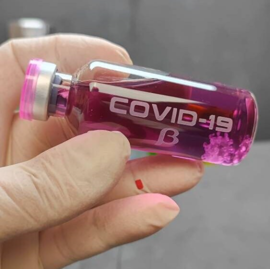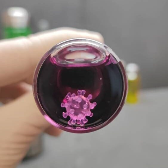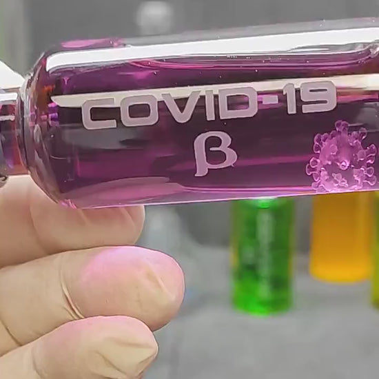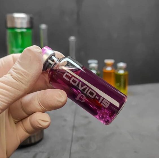 Reproducción ficticia del virus covid 19. Se trata de un vial de colección realizado envidio de borosilicato. En su interior contiene una reproducción del virus covid-19 con tecnología de impresión 3D. Son viales que contienen 30 ml de líquido en su interior y teñidos. Está completamente sellado y mide unos 7 cm de altura. Precauciones: consérvelo en lugar fresco y, lejos de la exposición de la luz solar. No agitar con fuerza. Conservar a temperatura ambiente entre 15 y 25 grados.