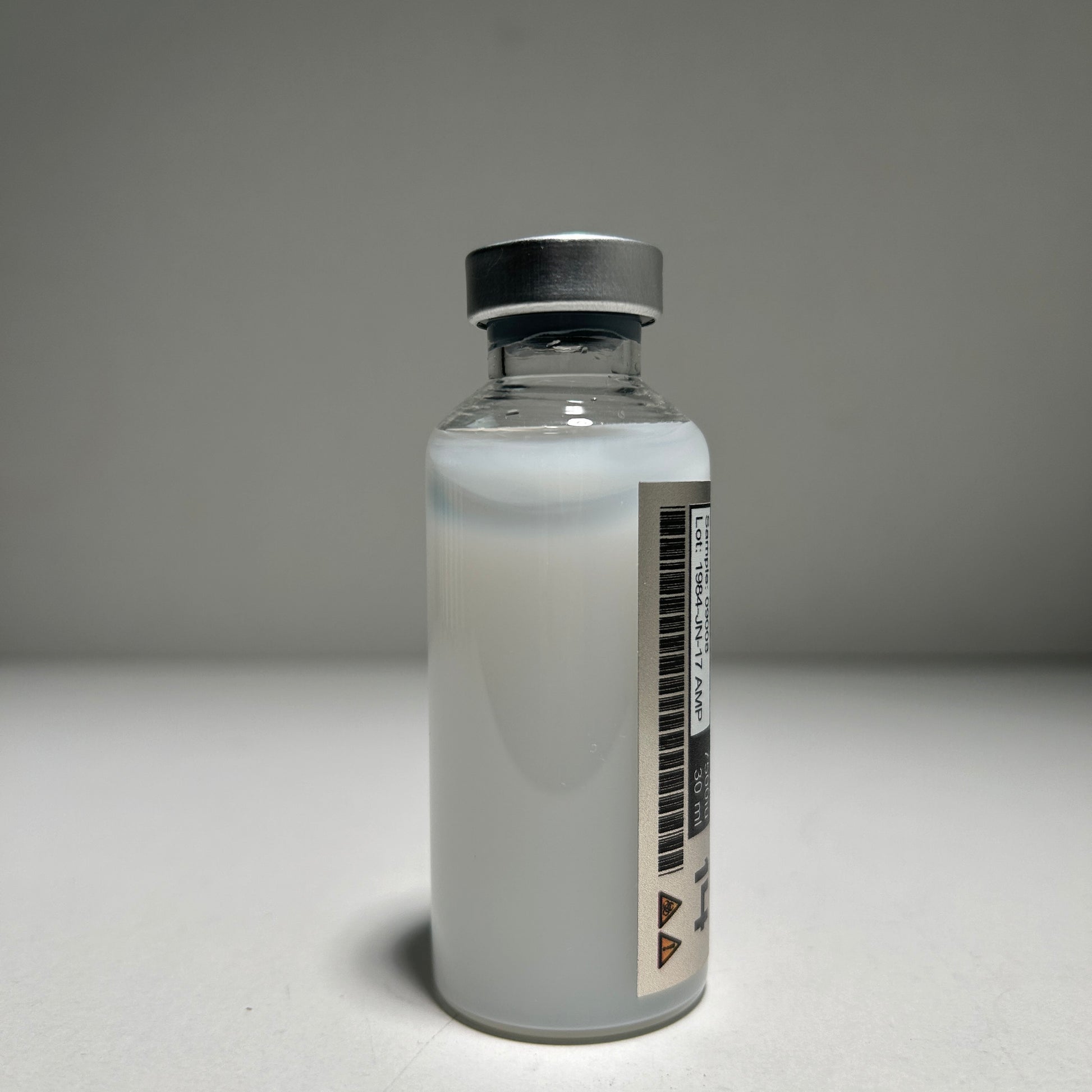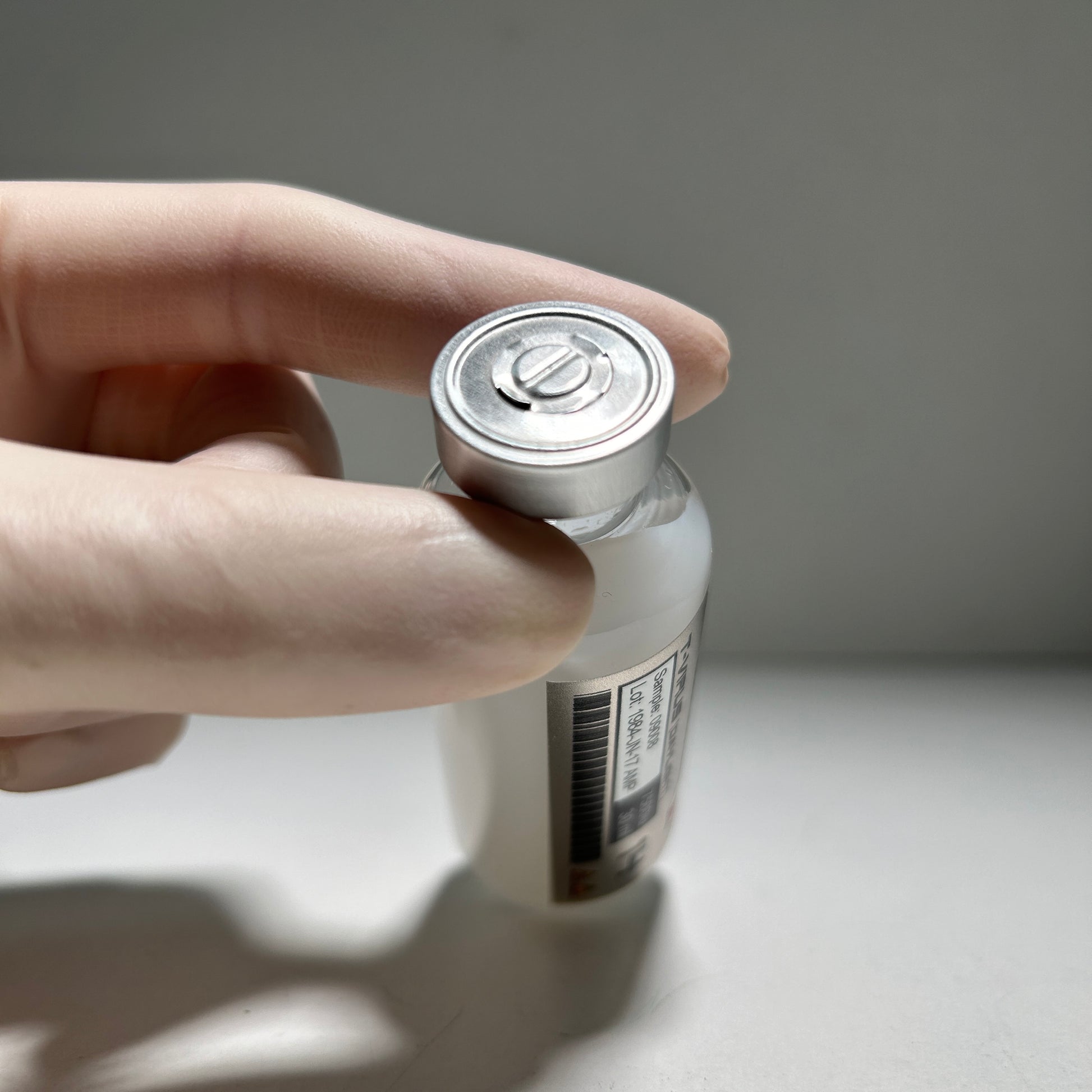 Es un vial que contiene 30 ml de líquido en su interior y está completamente sellado y mide unos 7 cm de altura.