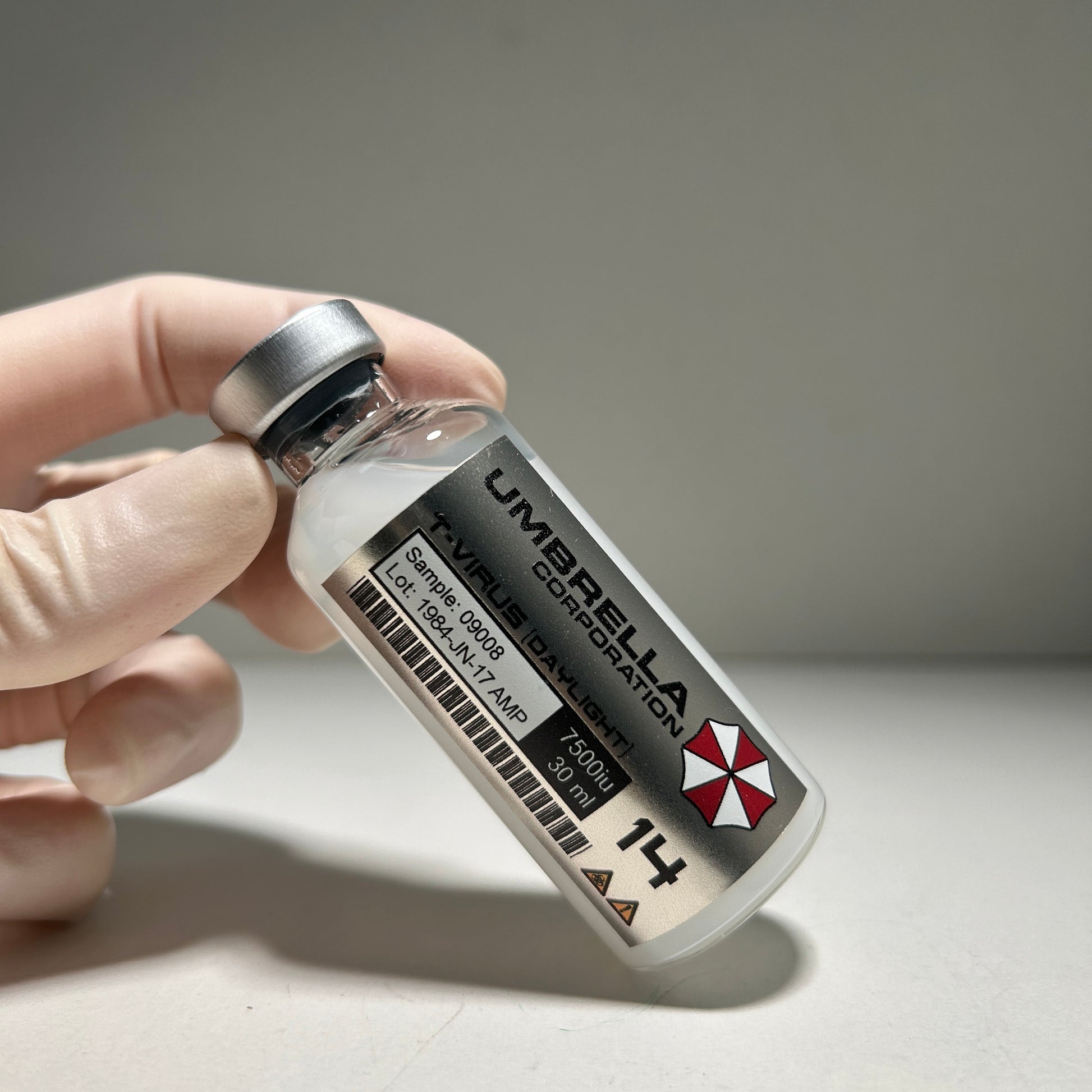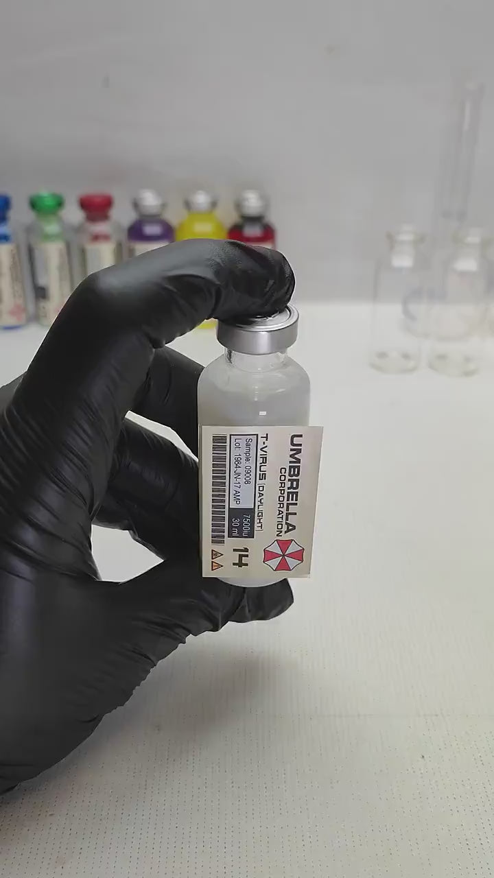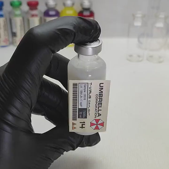 El vial está realizado en vídrio médico auténtico y sellado como un vial al médico. En su interior contiene un líquido viscoso y teñido con colorantes para darle una imagen igual al vídeojuego.