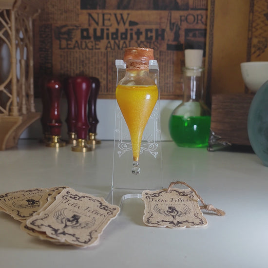 El polvo que contiene pasado un tiempo se asienta en el fondo, y el vial se vera de un color amarillo suave, solo remueva para que vuelva a brillar la magia, agítelo suavemente.