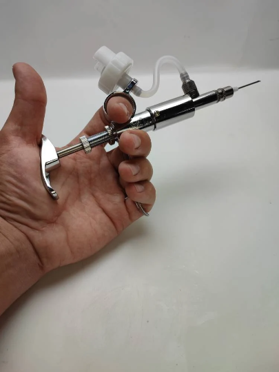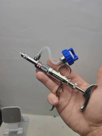 Pistola de inyección realizado en metal. Pensado para los viales de 30ml que están a la venta en mi tienda. Esta inspirada en los inyectores de las saga de Resident Evil.La aguja no tendrá zona punzante para evitar riesgos (NO FUNCIONAL).
