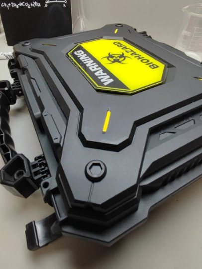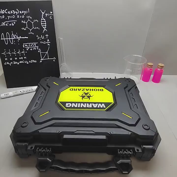 Maletín 32x28x8,5 cm inspirado en las películas y series de ciencia ficción. Está pensado para transportar el contenedor Biohazard ,el inyector o incluso los viales en su interior.En la tapadera viene pegada un metraquilato con las letras Biohazard y el símbolo correspondiente.
