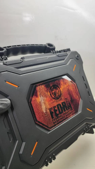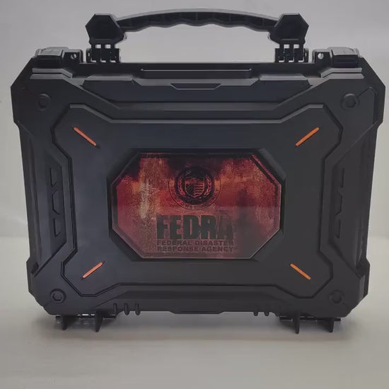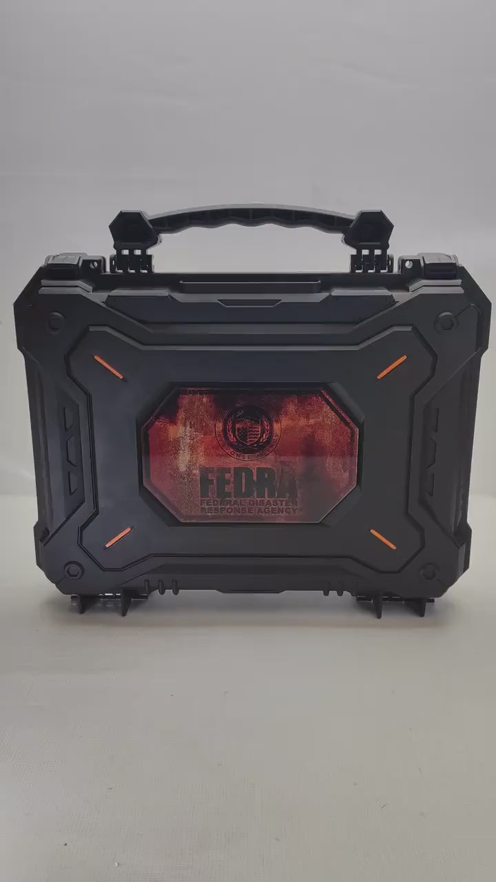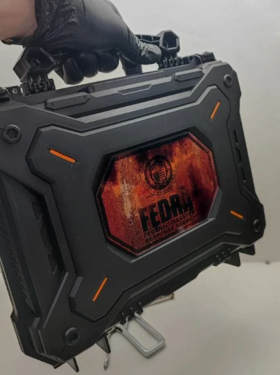 Maletín 32x28x8,5 cm inspirado en las películas y series de ciencia ficción. Está pensado para transportar el contenedor ,el inyector o incluso los viales en su interior .En la tapadera viene pegada un metraquilato con las letras FEDRAy el símbolo correspondiente.
