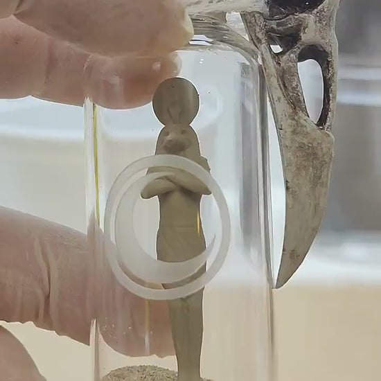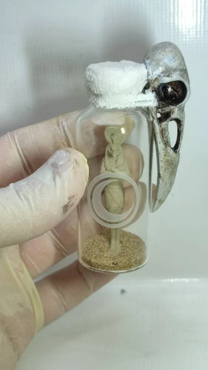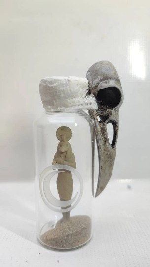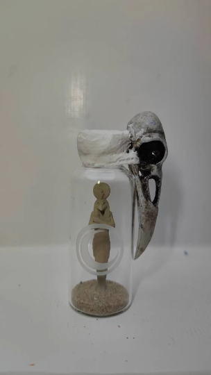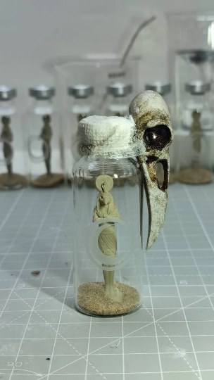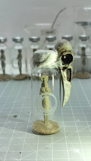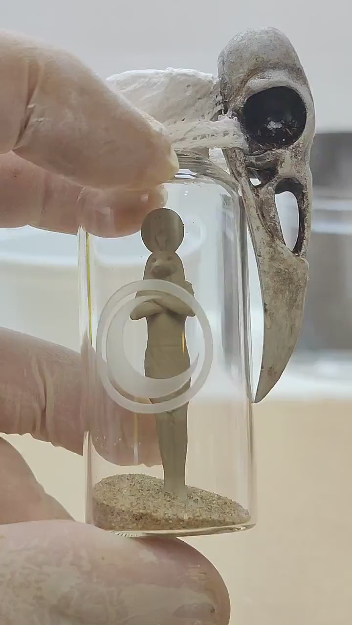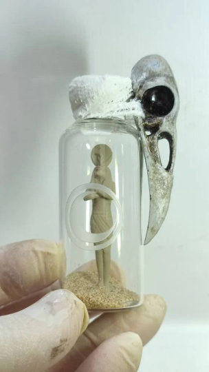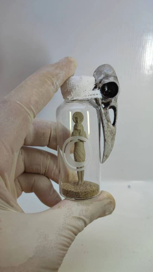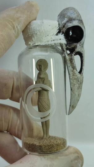 Estatua del destierro del dios Khonshu en la serie Moon Knight de Marvel y Disney, Impresa en resina de alta calidad y encerado dentro de un vial de cristal para que luzca en el tiempo, tiene una reproducción en resina de la cabeza del Dios Khonsho y esta pintada a mano usando técnicas de envejecimiento, contiene arena en su interior simulando ser arena del desierto de egipto. Una reproducción única para los fans de Marvel.