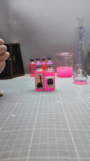 reacciona si es iluminado con un foco U.V. y podrás observar como se ilumina dando un color mágico desde el interior. El vial mide 8 cm de alto +/- y el recipiente contiene 30 cl de liquido de flúor.En la parte externa tiene una pegatina de papel artesanal donde recrea la imagen de la pelicula, ALUCINANTE!! Es un producto realizado artesanalmente con el mayor detenimiento en cada una de sus partes.