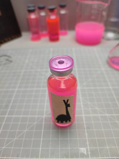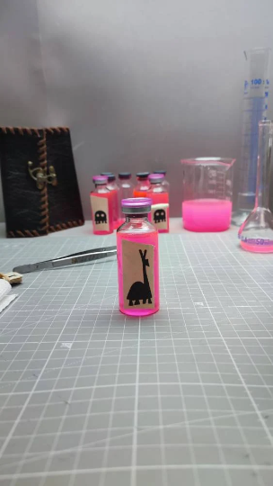 reacciona si es iluminado con un foco U.V. y podrás observar como se ilumina dando un color mágico desde el interior. El vial mide 8 cm de alto +/- y el recipiente contiene 30 cl de liquido de flúor.En la parte externa tiene una pegatina de papel artesanal donde recrea la imagen de la pelicula, ALUCINANTE!! Es un producto realizado artesanalmente con el mayor detenimiento en cada una de sus partes.