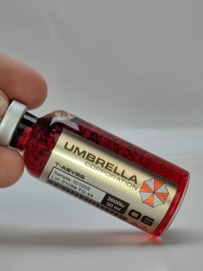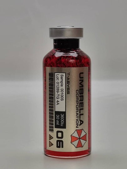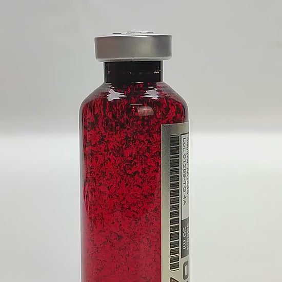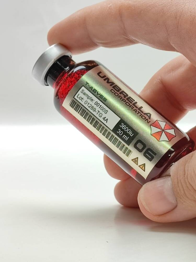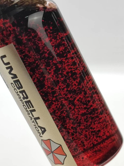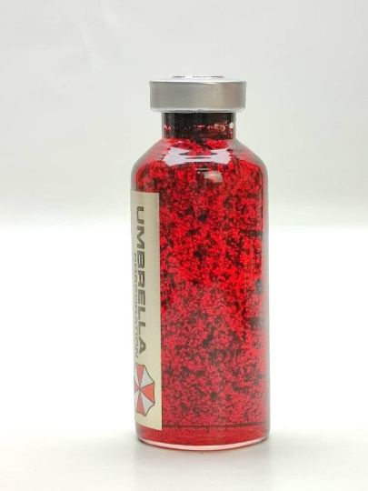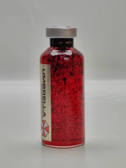 El vial está realizado en vídrio médico auténtico y sellado como un vial al médico. En su interior contiene dos líquidos de diferentes densidades y colores alucinantes, lo cual le da un realismo único cuando es "agitado".mientras no se agite quedarán en la superficie dando ese aspecto realista.