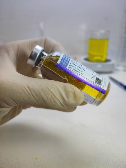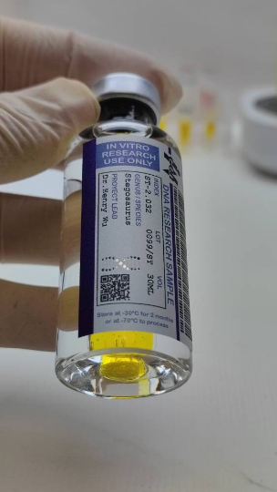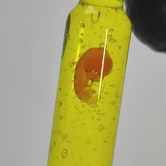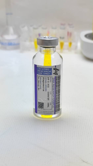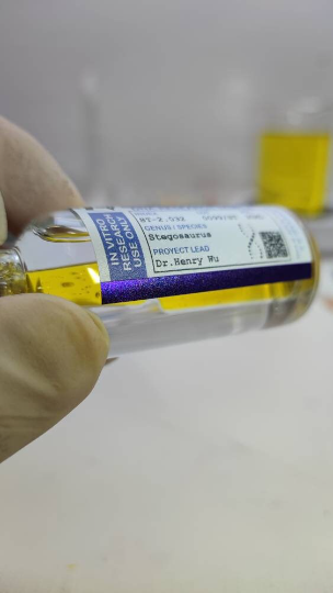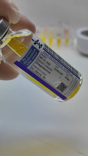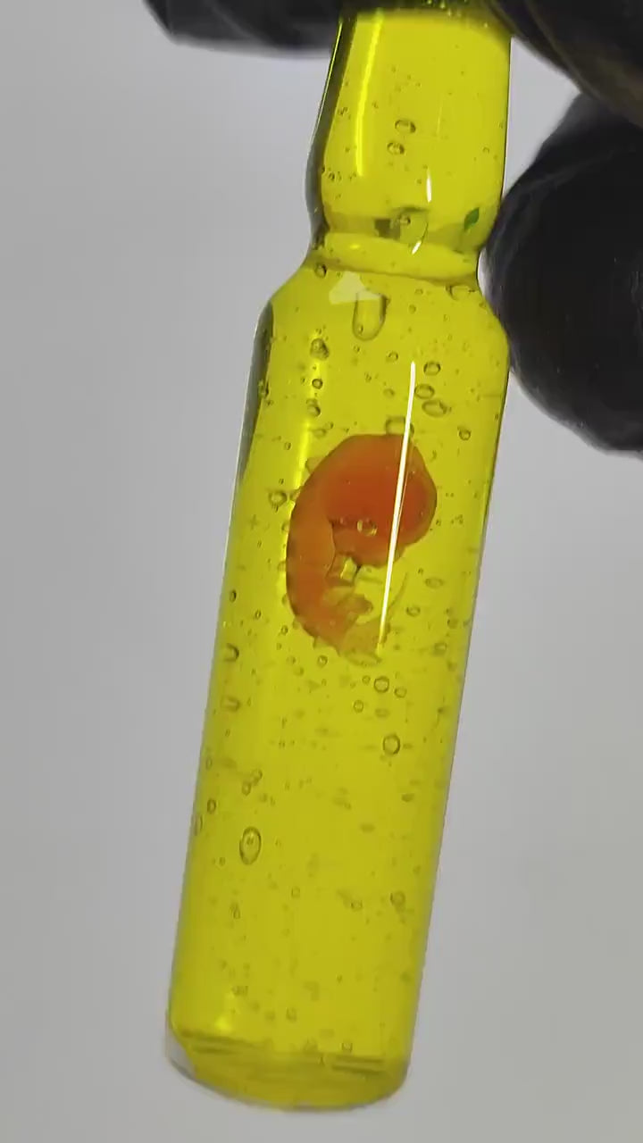 Se trata de un vial de 30 ml inspirado en la saga de Jurassic park. Contiene una ampolla relleno de un liquido espeso amarillo (Muestra ADN) donde flota en el una replica de embrión de dinosaurio 8 de semanas de vida.