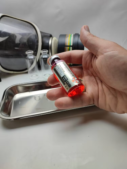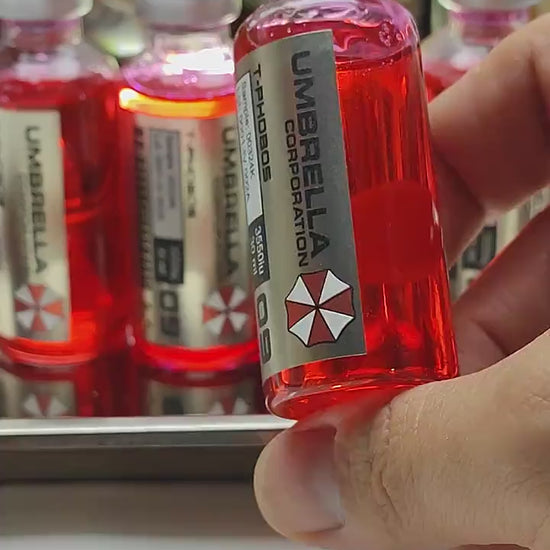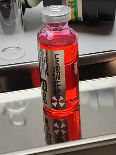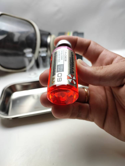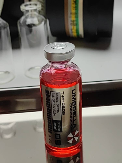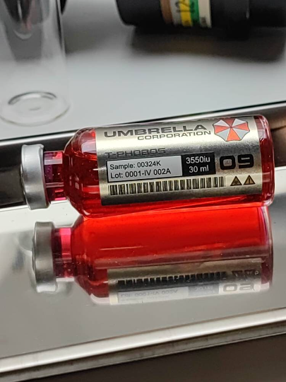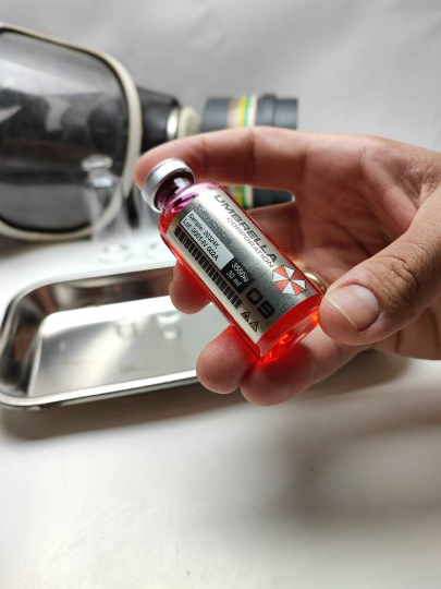 El vial está realizado en vídrio médico auténtico y sellado como un vial al médico. En su interior contiene un líquido viscoso y teñido con colorantes para darle una imagen igual al vídeojuego.