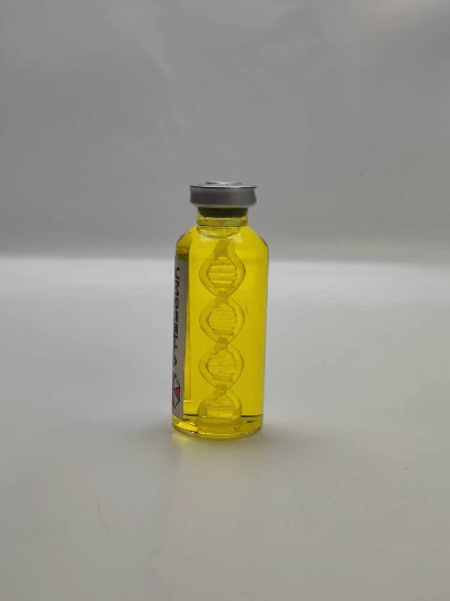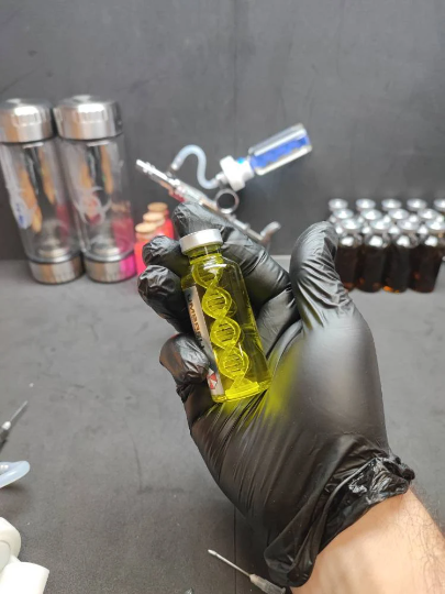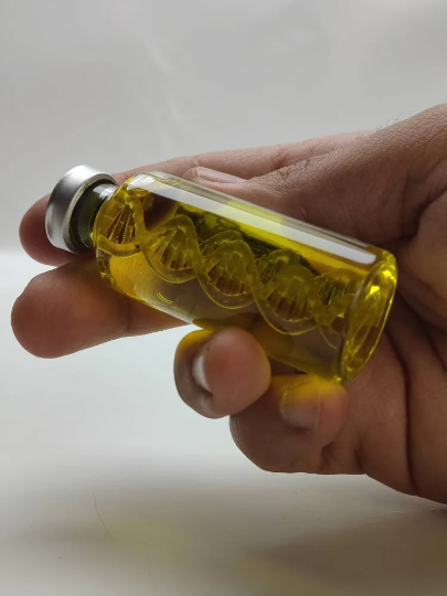 El vial está realizado en vidrio medico auténtico y sellado como un vial médico. En su interior tiene una doble hélice azul realizado con tecnología de impresión 3d y montado a mano. Son viales que contienen 30ml de líquido en su interior , completamente sellado y mide unos 7cm de altura.