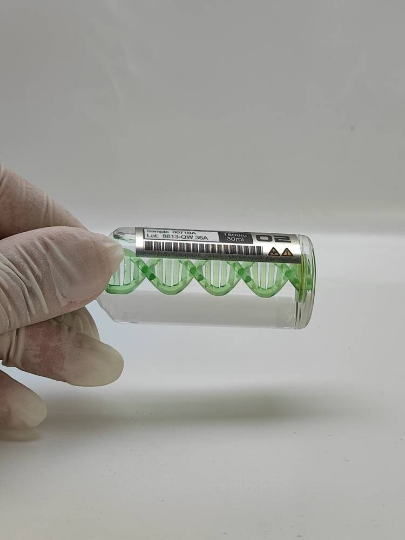 El vial está realizado en vidrio medico auténtico y sellado como un vial médico. En su interior tiene una doble hélice azul realizado con tecnología de impresión 3d y montado a mano. Son viales que contienen 30ml de líquido en su interior , completamente sellado y mide unos 7cm de altura.
