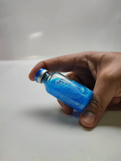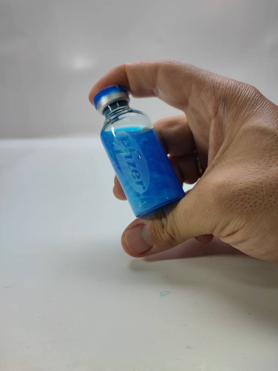 Es una reproducción ficticia de la vacuna Pfizer. Se trata de un vial de colección realizado en un vial médico auténtico. En su interior contiene un líquido de color y un polvo reflectante a la luz. Son viales que contiene 30 ml de líquido en su interior completamente sellado y mide unos 7 cm de altura.AGITELO PARA VER SU MAGIA!!!. PRECAUCIONES: consérvelo en un lugar fresco y seco lejos de la exposición de la luz solar. Conservar a temperatura ambiente entre 15 y 25 grados