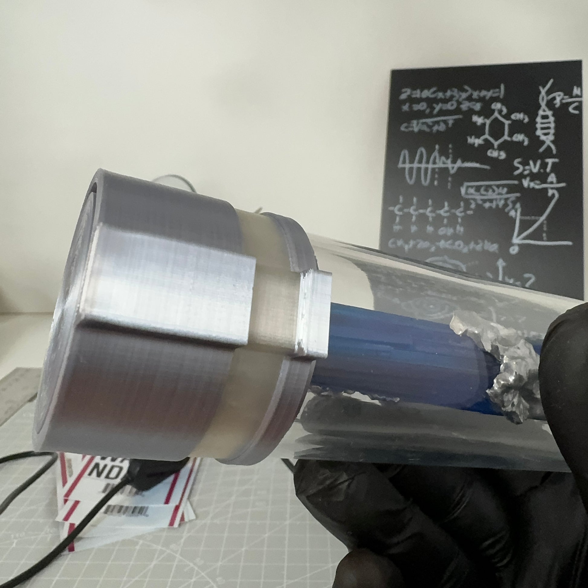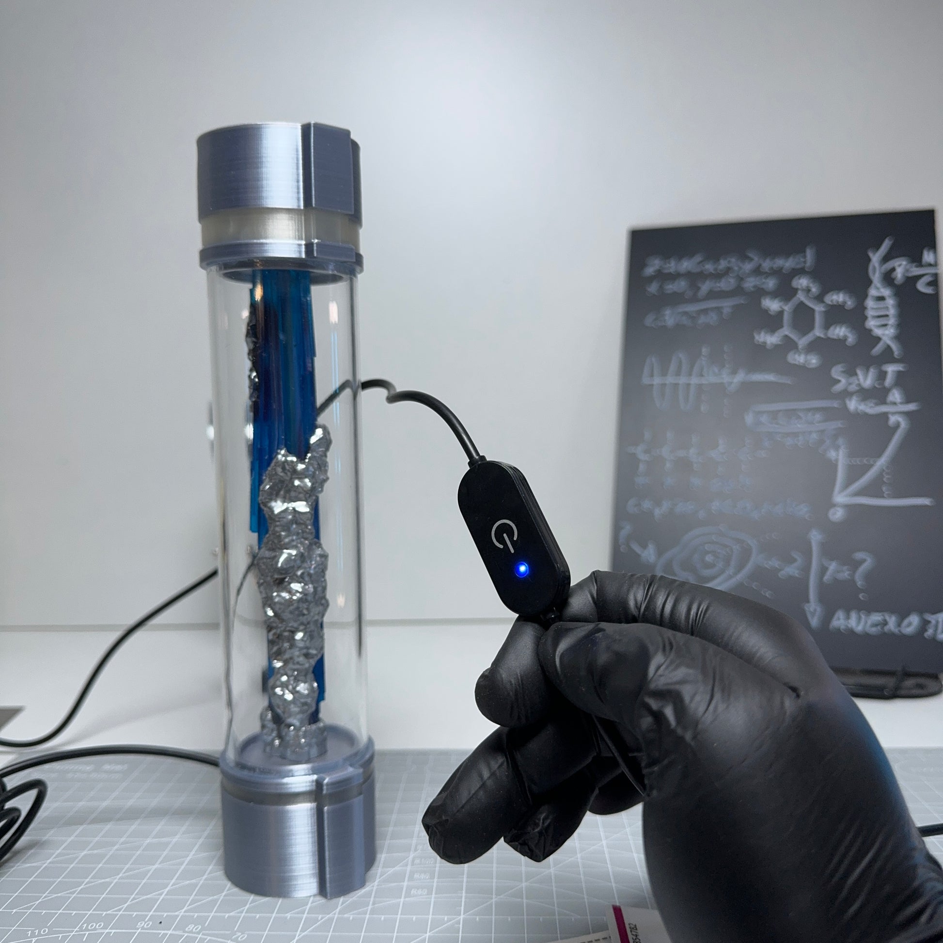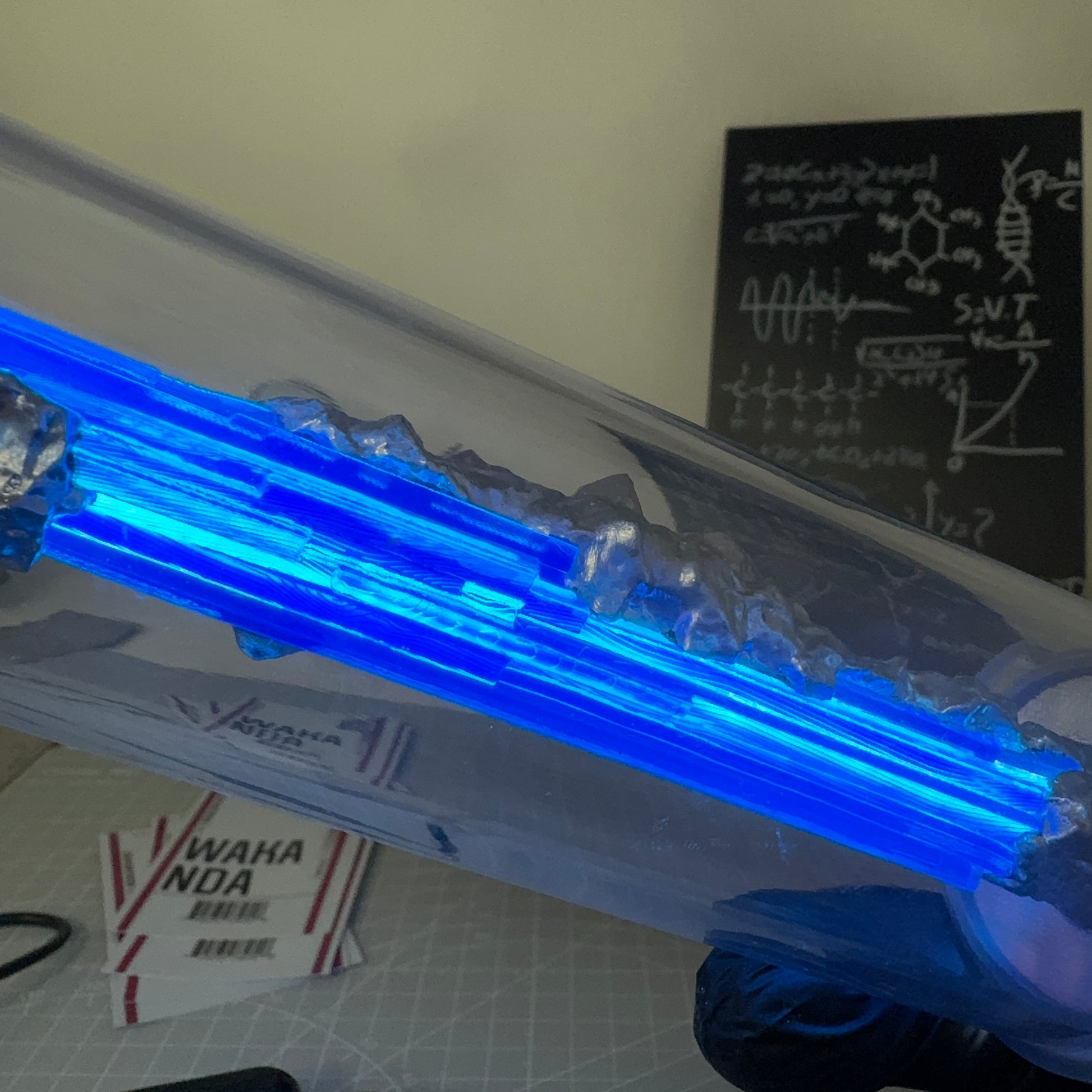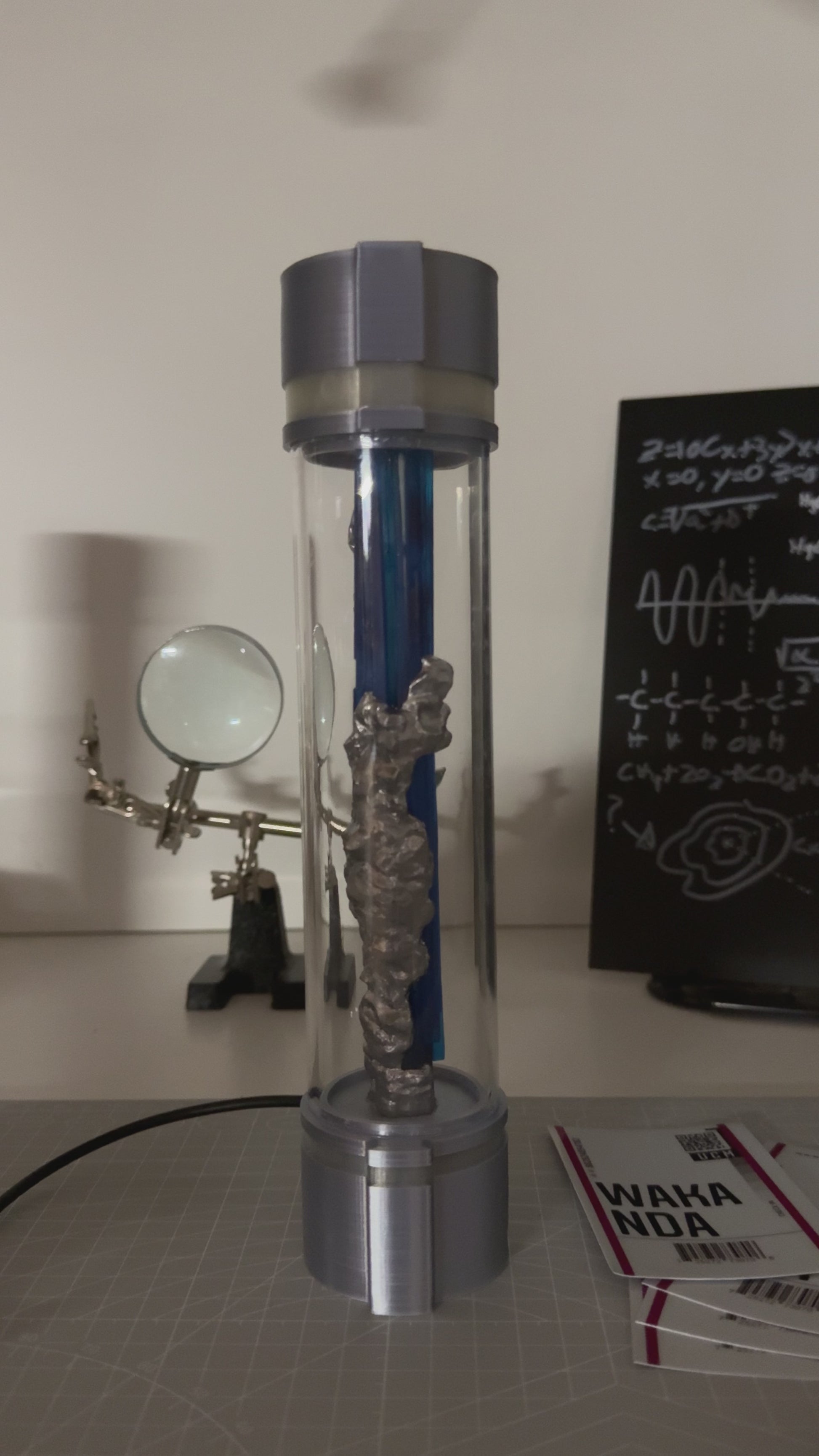 Tanto la parte superior como la inferior está impreso en PLA metálico seda para dar esa apariencia brillante simulando ser natal y tiene una franja de un tono translúcido para poder dar el efecto de luz alucinante.